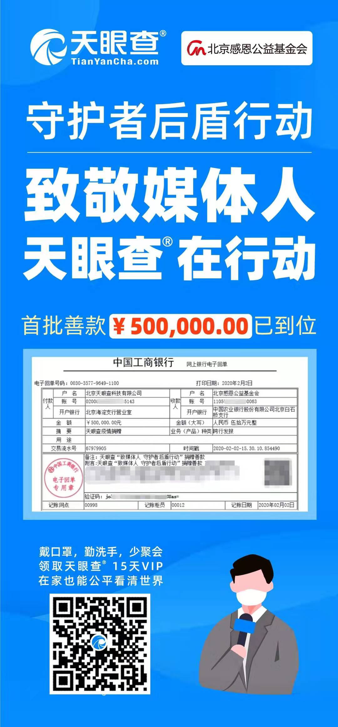 向北京感恩公益基金會捐贈50萬人民幣,定向支援奮斗在疫情一線的新聞記者和媒體人。
