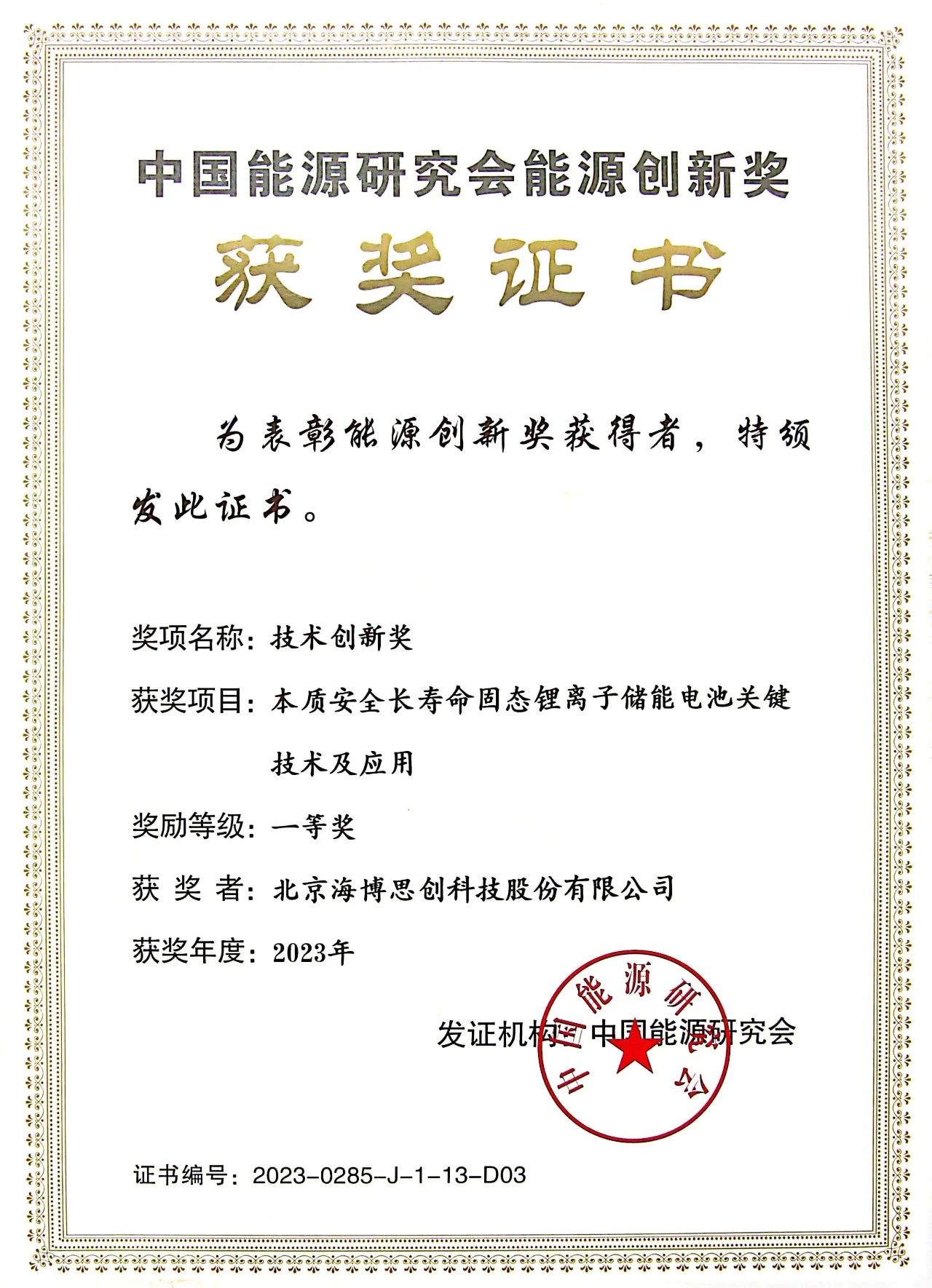 中國能源研究會(huì)能源創(chuàng)新獎(jiǎng)一等獎(jiǎng)